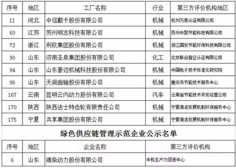 根據(jù)《工業(yè)和信息化部辦公廳關(guān)于開展綠色制造體系建設(shè)的通知》(工信廳節(jié)函〔2016〕586號)、《關(guān)于請推薦第一批綠色制造體系建設(shè)示范名單的通知》要求,經(jīng)中國鑄造協(xié)會對行業(yè)內(nèi)企業(yè)進行積極組織、推薦,近日工信部對首批綠色制造體系示范企業(yè)名單進行公示。共享集團、中信戴卡、濟南圣泉、天潤曲軸、蘇州明志、陜西法士特、山東豪邁、利歐集團、昆明云內(nèi)等9家企業(yè)入選綠色工廠公示名單,濰柴動力入選綠色供應(yīng)鏈管理示范企業(yè)公示名單。