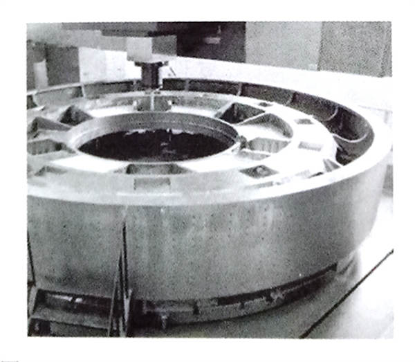 部分國外發(fā)達(dá)國家生產(chǎn)球墨鑄鐵具有較高的專業(yè)技術(shù)水平,如在結(jié)構(gòu)復(fù)雜、技術(shù)條件苛刻、環(huán)境條件惡劣的核乏燃料球墨鑄鐵儲(chǔ)運(yùn)容器鑄件生產(chǎn)上德國Siempelkamp公司取得重大成功(圖1),該鑄件尺寸為Ø2500mm x 5976mm,壁厚為400mm,總質(zhì)量為115000kg,其生產(chǎn)工藝控制要求極其嚴(yán)格,是世界球墨鑄鐵鑄件高水平的代表。美國通用電器GE公司6兆瓦海上風(fēng)電是當(dāng)前全球投入商業(yè)運(yùn)營的大型風(fēng)機(jī)產(chǎn)品,所用轉(zhuǎn)子鑄件(圖2)直徑6900mm,總質(zhì)量達(dá)40000kg,是鑄件領(lǐng)域高難薄壁大型旋轉(zhuǎn)產(chǎn)品,不僅要求無結(jié)構(gòu)缺陷,而且在6900mm直徑范圍內(nèi),圓心偏移不能超過15um,該產(chǎn)品曾先后在意大利、法國等多家工廠進(jìn)行試制,但因鑄造缺陷終未能成功。