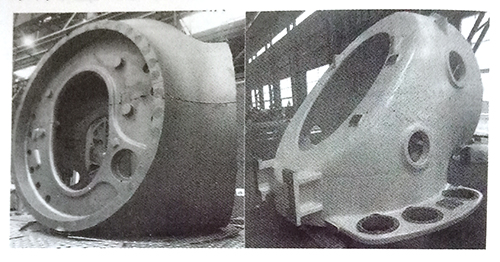 圖3 風(fēng)電球墨鑄鐵輪轂鑄件(左)和機(jī)架鑄機(jī)(右)